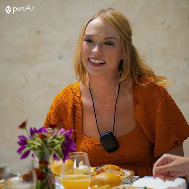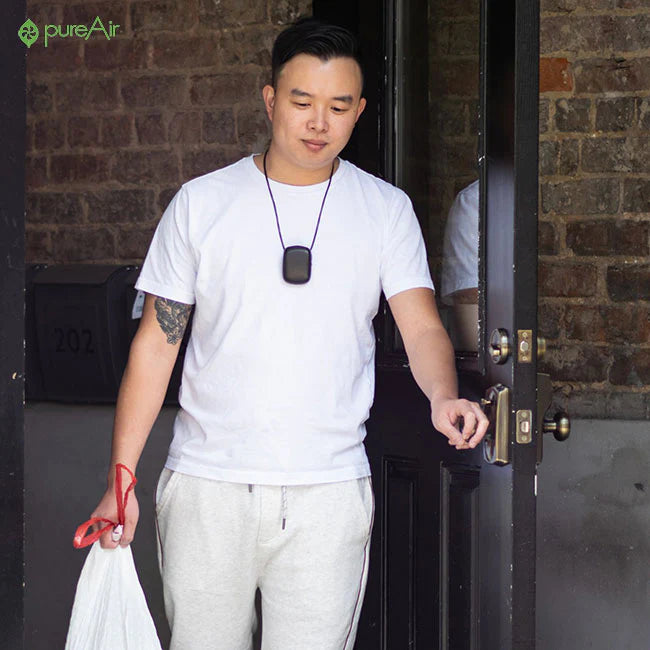 pureAir PERSONAL air purifier is a sleek, wearable personal air purifier that creates a personal 3 foot clean-air zone by repelling particles from your breathing space. With pureAir PERSONAL air purifier visit friends and family without the negative effects of other's pet dander, perfumes, or colognes.